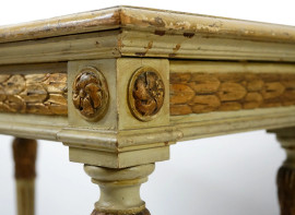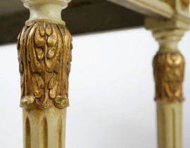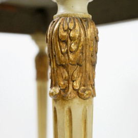 Coppia di tavolini stile impero, in legno intagliato e laccato, con intarsi dorati, piano rettangolare poggiante su quattro gambe a foggia di colonne rastremate, sec. XX, cm 71x71x41,5. (Difetti).