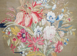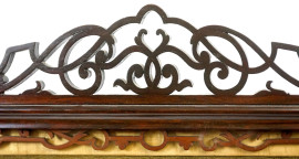 Copricamino con sostegni in legno intagliato e frontone traforato, con pannello centrale floreale ad ago, sec. XX, cm 120x67x41,5. (Difetti)