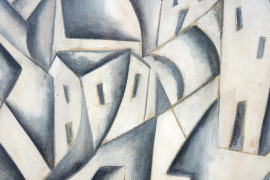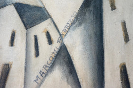 Fabrizio Marconi "Marfa", Paese di Ogisvaldo futurista, olio su carta telata, cm 34x24, firmato in basso a sinistra, entro cornice
