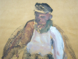Figura maschile seduta, acquerello su carta, cm 30x24, dedicato, firmato e datato "24/8/54", entro cornice. (Difetti)