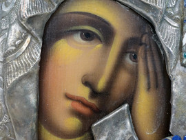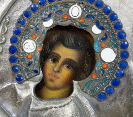 Icona rappresentante una Madonna con il Bambino, riza in metallo argentato e smalto, Russia, XX secolo, cm 31,5x27