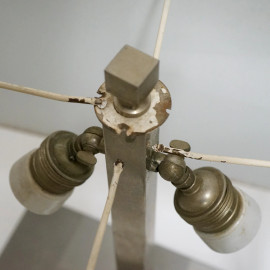 Lotto composto da cornice rettangolare in metallo argentato, sec. XX, cm 34x40, e da una lampada a due luci con corpo parallelepipedo in metallo argentato e cappello in stoffa, sec. XX, cm 67x36x19. (Difetti)