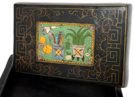 Lotto composto da quattro cofanetti cinesi in lacca rossa e nera e in Papier mâché con decori intagliati e dipinti, XX secolo, misura max cm 7,5x23x16 (difetti)