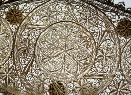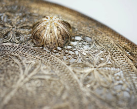 Lotto composto da un vassoio e quattro portabicchieri in filigrana d'argento, XX secolo, cm 32,5x16, misure portabicchiere cm 4,5x6 (difetti)