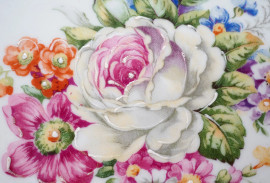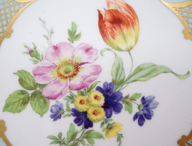 Lotto di due piatti in porcellana policroma con decori floreali e finiture dorate, XX secolo, diametro max cm 32,5