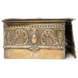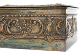 Lotto di due scatole in metallo argentato e sbalzato, misure max cm 5x32x9,5, (difetti, parti rotte)