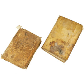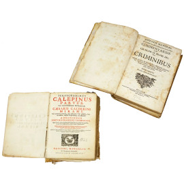Lotto di due volumi del XVII secolo: Perfectissimus Calepinus Parvus sive correctissimum Dictionarium Caesaris Calderini Mirani, Bassani, 1744.; Antonii Matthaei...Commentarius ad Lib XLVII et XLVIII Dig. […], Wesel, 1702. (Difetti e segni del tempo)