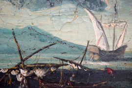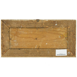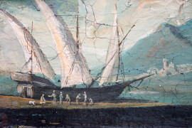 Marina con velieri, sec. XIX, olio su tavola, cm 11x30, entro cornice. (Difetti)