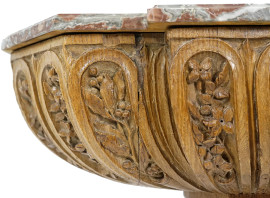 Mensola in legno scolpito con piano in marmo, decori a motivi floreali, XVIII secolo, cm h 33x64x22,5, (difetti)