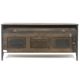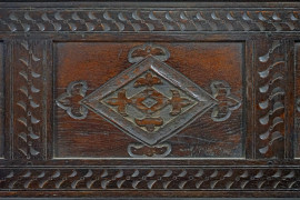 Mensola in rovere con decori intagliati a motivi geometrici tripartiti, XIX secolo, cm 56x116x17