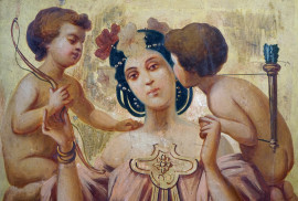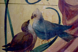 Mobile in stile Liberty in legno impiallacciato con decori floreali incisi e sportello centrale dipinto raffigurante una figura femminile con due putti su fondo oro, XX secolo, cm 106x120x44.5 (difetti)