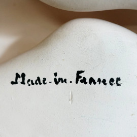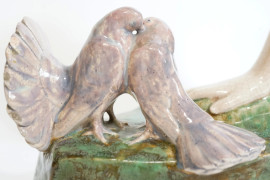 Scultura in ceramica policroma rappresentante un nudo femminile con due colombe, firmato Morlon, cm 33x58