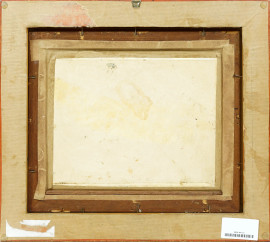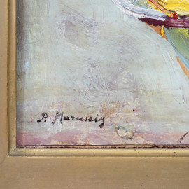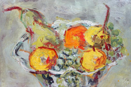 Natura morta con cesta di frutta, olio su cartone, cm 21,5x27,5, firmato, entro cornice. (Difetti)