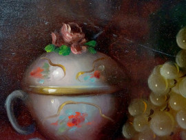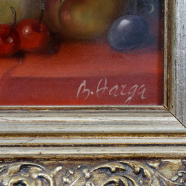Natura morta con vasellame, olio su masonite, firmato in basso a destra B. Harga, cm 20.5x27, entro cornice