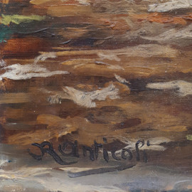 Paesaggio boschivo, olio su cartone telato, primi anni 50 del XX secolo, cm 40x30, firmato