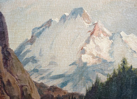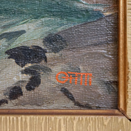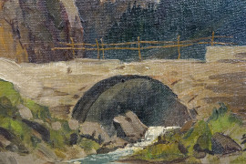 Paesaggio montano con torrente, olio su cartoncino telato, siglato a sinistra, XX secolo, cm 30x20, entro cornice