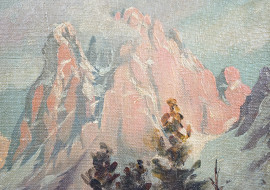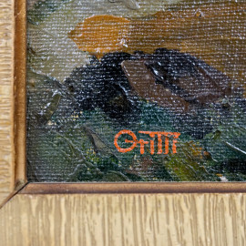 Paesaggio montano, olio su cartoncino telato, siglato a sinistra, XX secolo, cm 30x20, entro cornice