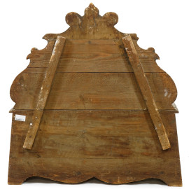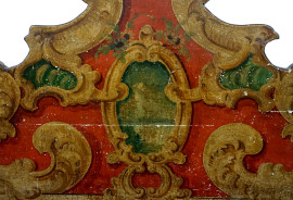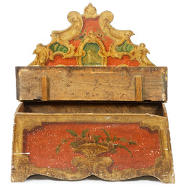 Panchetta in legno intagliato e dipinto, con seduta alzabile e schienale sagomato, XIX-XX secolo, cm 98,5x26,6x100,5. (Difetti e mancanze)