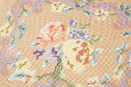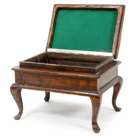 Panchetto poggiapiedi in legno e tessuto ricamato, apribile, quattro gambe mosse, XX secolo, cm 41x51x38,5, (difetti)