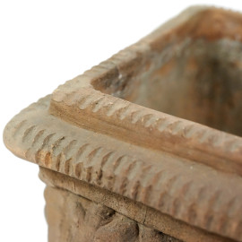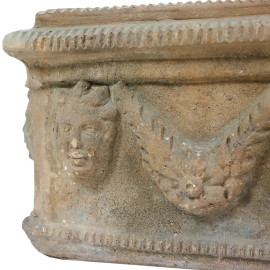 Portavaso in terracotta di forma rettangolare, decorato a mascheroni e festoni, sec. XX, cm 16x38,5x20