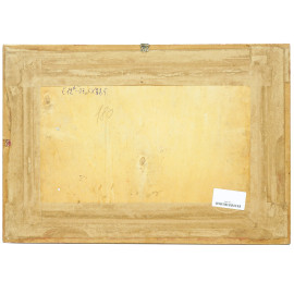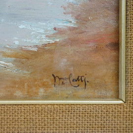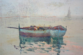 Scorcio di spiaggia con imbarcazioni, olio su compensato, cm 23,5x40, firmato, entro cornice. (Difetti)