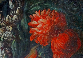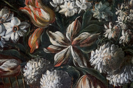 Scuola francese del XVIII-XIX secolo, Natura morta con cesta di fiori e frutta, olio su tela, cm 75x100, entro cornice