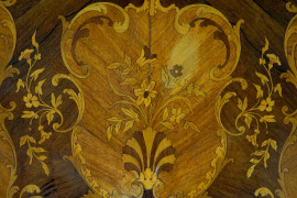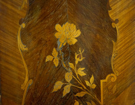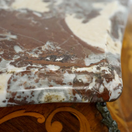 Secretaire impiallacciato in satinwood con decori intarsiati in vari legni a motivi floreali, tre cassetti, inserti in bronzo, piano in marmo, XX secolo, cm 128,5x68x30