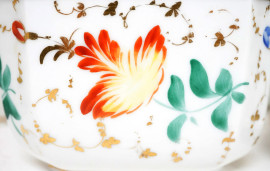 Servizio da tè in porcellana decorata in oro e motivi floreali, composto da una teiera, una lattiera, una zuccheriera, sei tazze e sei piattini, Francia, sec. XIX-XX. (Difetti)