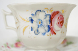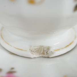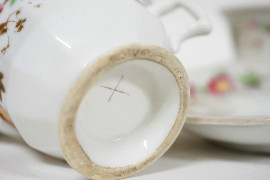 Servizio da thè in porcellana bianca con decori floreali e finiture dorate, composto da sette tazze con piattini, una teiera e una zuccheriera, sec. XIX-XX, misura max cm 16x24x12 (difetti)