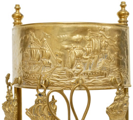 Set da camino in metallo dorato con decorazioni a rilievo rappresentanti imbarcazioni, sec. XX, cm 37,5x21