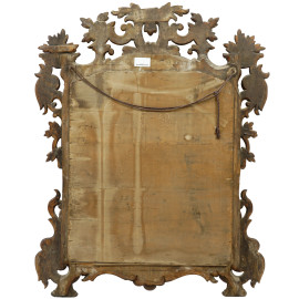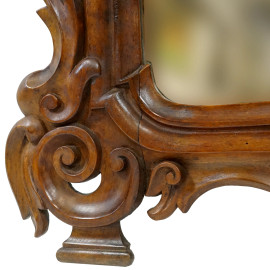 Specchio con cornice in legno intagliato a motivi a volute e floreali, XIX secolo, ingombro cm 109x86 (difetti)