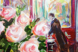 Stellario Baccellieri (1950), Rose al Caffè Greco, olio su cartone, firmato in basso a destra, cm 43,5x40,5, entro cornice