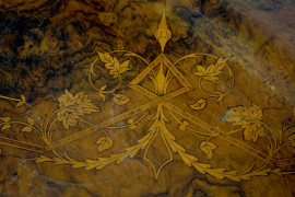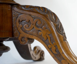 Tavolo in noce e radica, piano di linea ovale con intarsi e filettature in legno chiaro, fusto a balaustro poggiante su quattro piedi desinenti a ricciolo, fine del XIX secolo, cm h 75x144x112 circa, (difetti)
