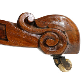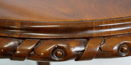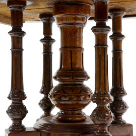 Tavolo ovale in noce, fine XIX-inizi XX secolo, piano con profilo scolpito, fusto centrale a balaustro tornito circondato da quattro colonne riunite al centro, piedi desinenti a ricciolo, cm h 75x112x140