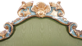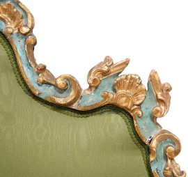 Testata da letto in legno intagliato laccato e dorato, rivestita in tessuto verde, sec. XIX-XX, cm 102x172 (Difetti)