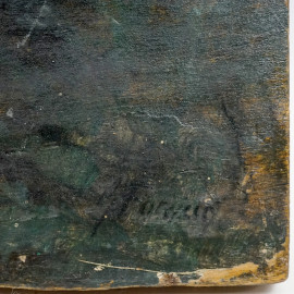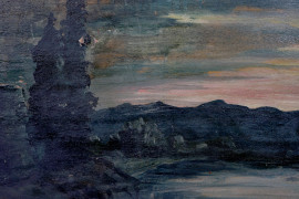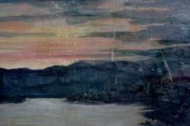Tramonto sul lago, olio su tavola, XX secolo, firmato, cm 18x38,5 (difetti)