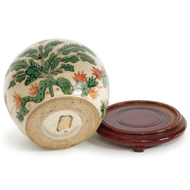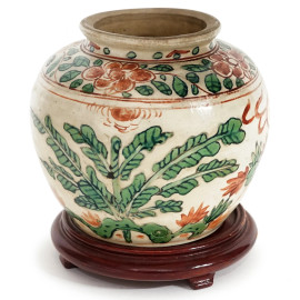 Vaso cinese in porcellana policroma con decoro rappresentante un dragone e motivi vegetali e floreali, base in legno, primo XX secolo, altezza cm 16,5
