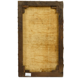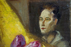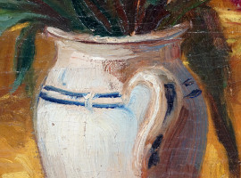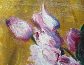 Vaso di tulipani nello studio del pittore, olio su tela, XX secolo, firmato, cm 75x45