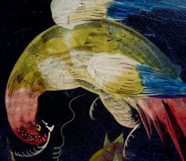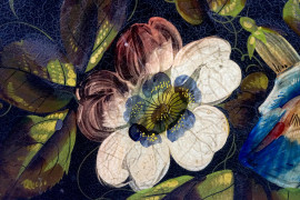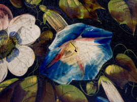 Vassoio in metallo laccato nero con decoro centrale rappresentante fiori e un pappagallo, XX secolo, cm 77x58 (difetti)