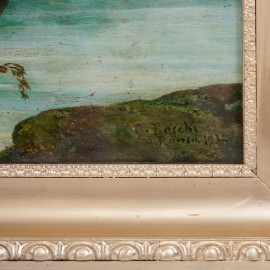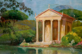 veduta del tempio di Esculapio a Villa Borghese, sec. XIX, olio su cartone, cm 39x68, firmato, entro cornice. (Difetti)