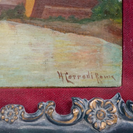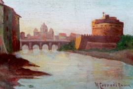Veduta di Castel Sant'Angelo, olio su tavoletta, cm 9,5x13,5, firmato, entro cornice. (Difetti)