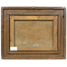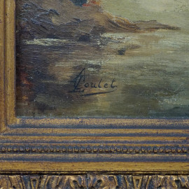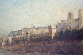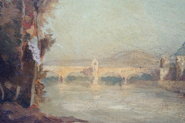 Veduta di città con fiume, olio su tela, fine XIX secolo, firmato, cm 30x40,5, entro cornice