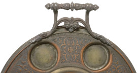 Alzatina in metallo a foggia di coppa su vassoio circolare, decori cesellati a motivi vegetali, poggiante su 4 piedini, XX secolo, cm 12,5x23x20,5 (difetti, mancanze)