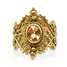 Anello in oro 18 KT, decorato a cesello, con topazio giallo (CT 1.25), peso gr. 8,1, misura n. 16