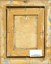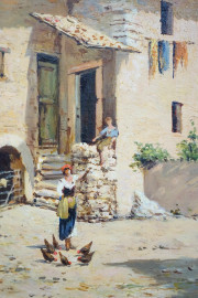 Anonimo, fine XIX - inizi XX secolo, In cortile, olio su tavoletta, cm 15x10, entro cornice