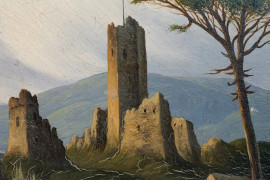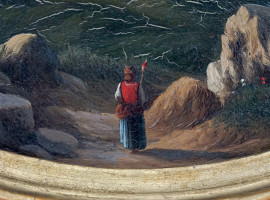 Anonimo, sec.XIX, Coppia di vedute (campagna pisana e campagna romana), olio su cartone ovale, cm 22x26, entro cornice
