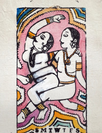 Antico foglio raffigurante scena del Kamasutra, xilografia su carta vergata con interventi cromatici realizzati a mano, cm 37x26
