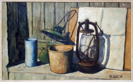 Artista del Novecento, composizione con oggetti, 1969, olio su tela, cm 50x80, firmato e datato in basso a destra, con cornice