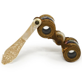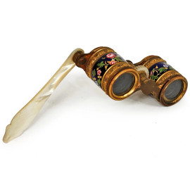 Binocolo da teatro in ottone e smalto policromo con decori floreali, XIX secolo, cm 12x5 (difetti)