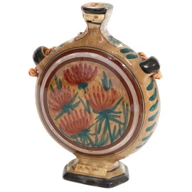 Bottiglia a forma di fiaschetta in ceramica policroma, raffigurante un volto femminile su un lato e dei fiori sull'altro, XX secolo, altezza cm 21